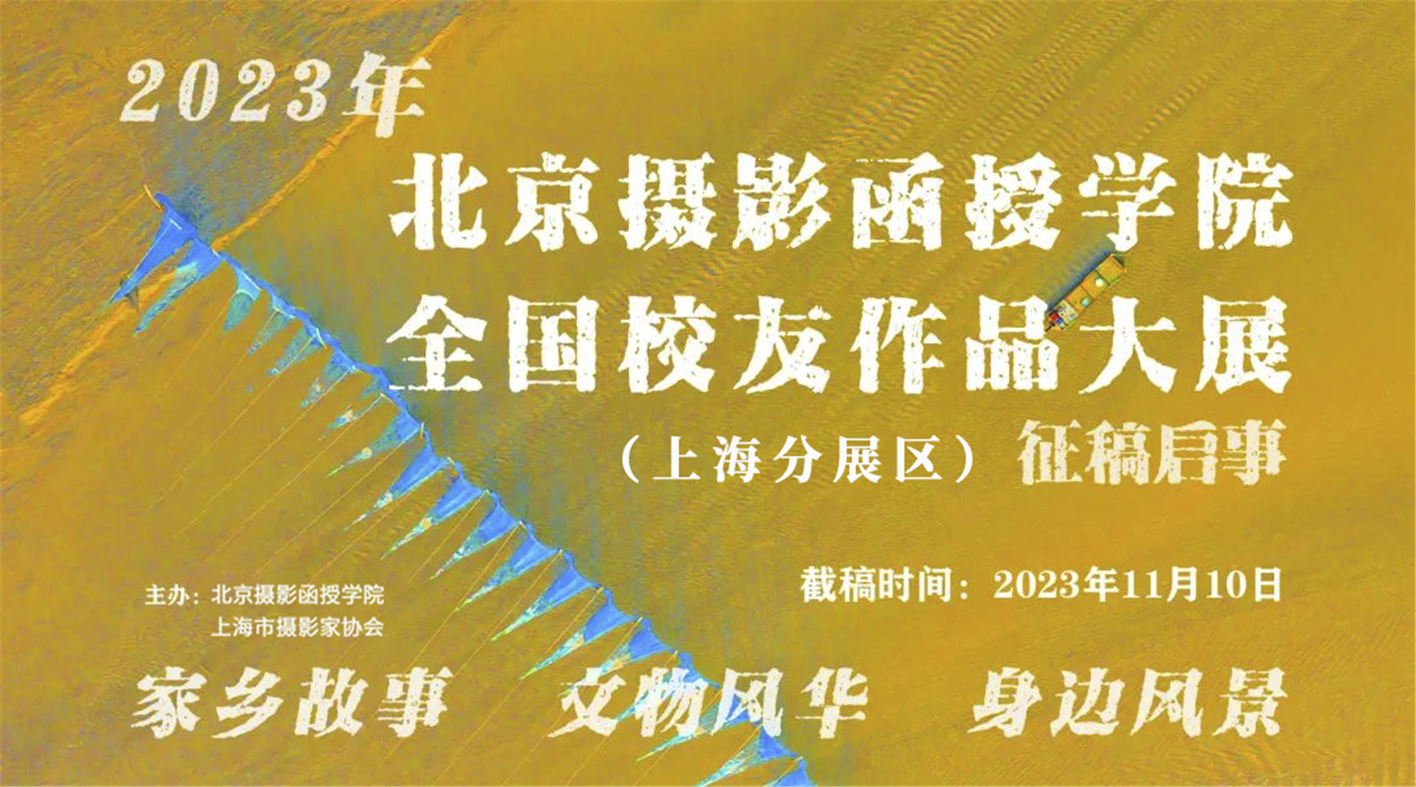 北京摄影函授学院于1984年由中国摄影家协会创办,三十九年,桃李芬芳。2023年北京摄影函授学院全国校友作品大展,以促进摄影文化发展、为学员提供展示平台为宗旨。本次大展设上海分展区,诚邀2016年以后(含2016年)参加北京摄影函授学院学习的上海校友踊跃参与。